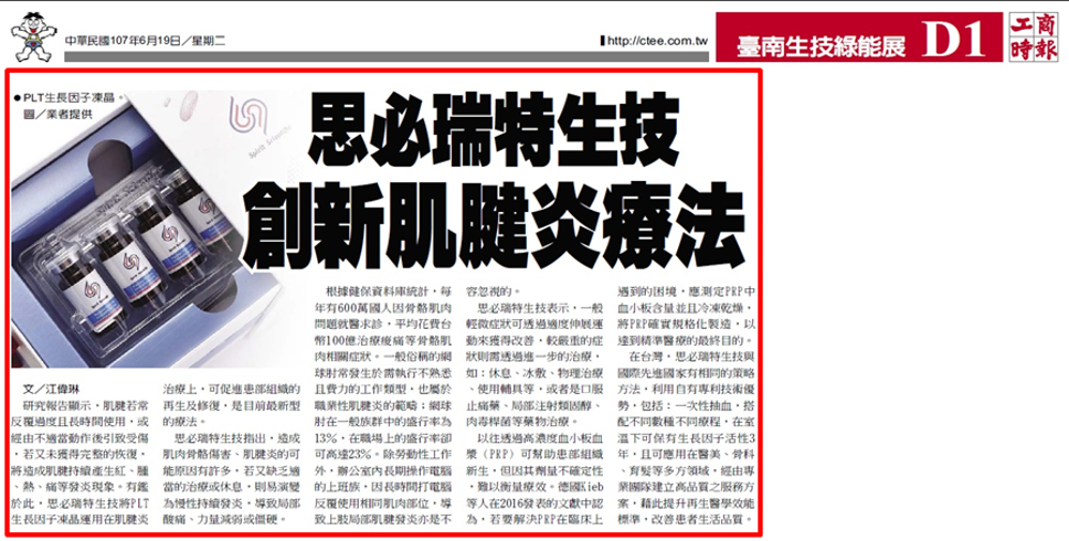 研究報告顯示,肌腱若常反覆過度且長時間使用,或經由不適當動作後引致受傷,若又未獲得完整的恢復,將造成肌腱持續產生紅、腫、熱、痛等發炎現象。有鑑於此,思必瑞特生技將PLT生長因子凍晶運用在肌腱炎治療上,可促進患部組織的再生及修復,是目前最新型的療法。